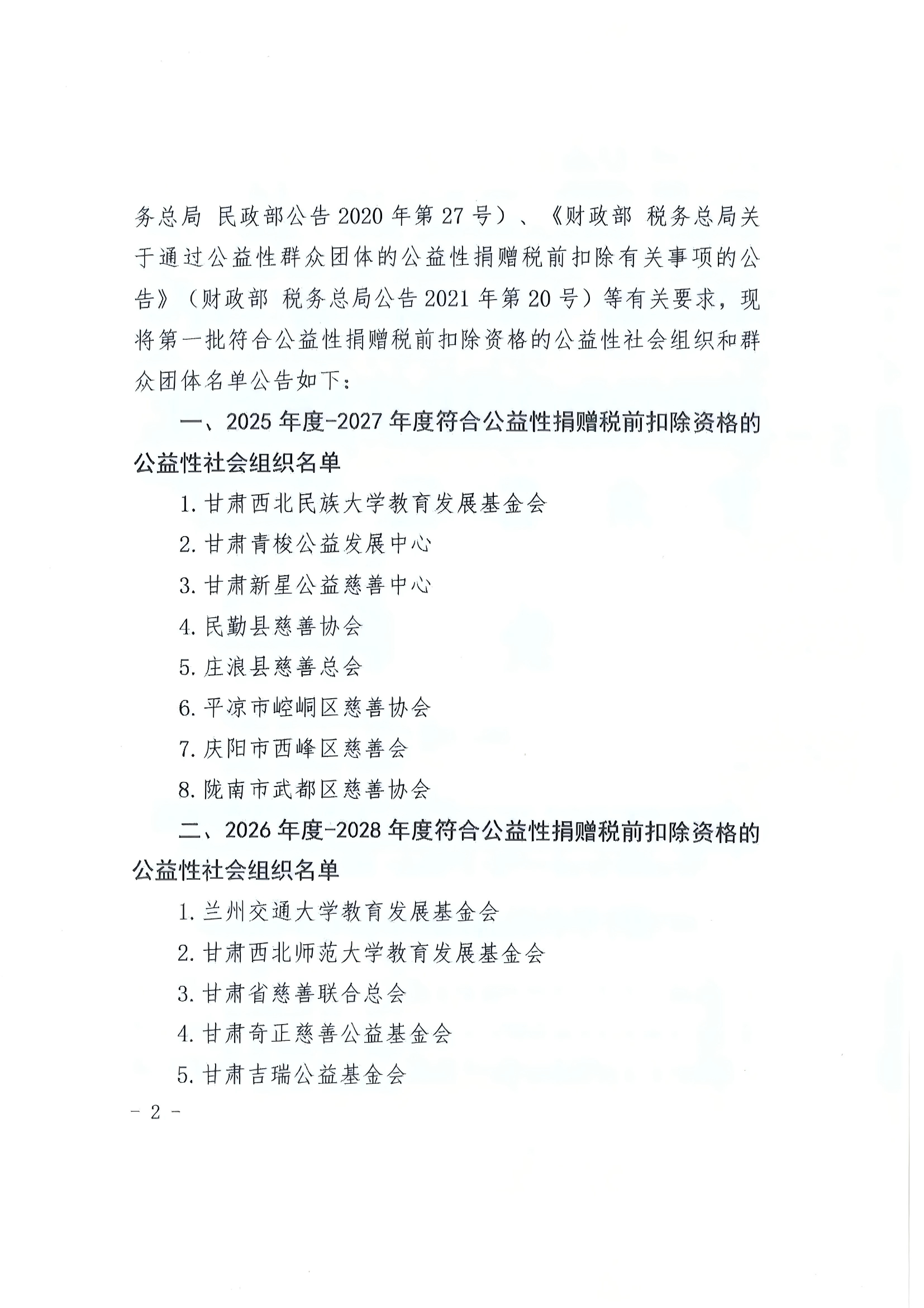 公告| 甘肅省財(cái)政廳國家稅務(wù)總局甘肅省稅務(wù)局甘肅省民政廳關(guān)于發(fā)布 2025年第一批公益性捐贈(zèng)稅前扣除資格名單的公告